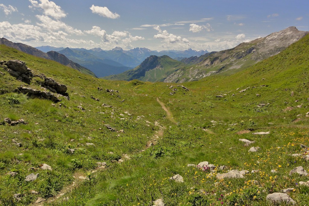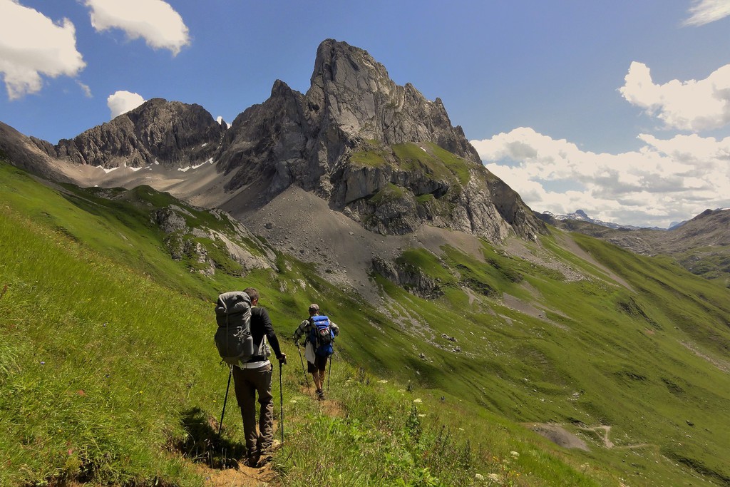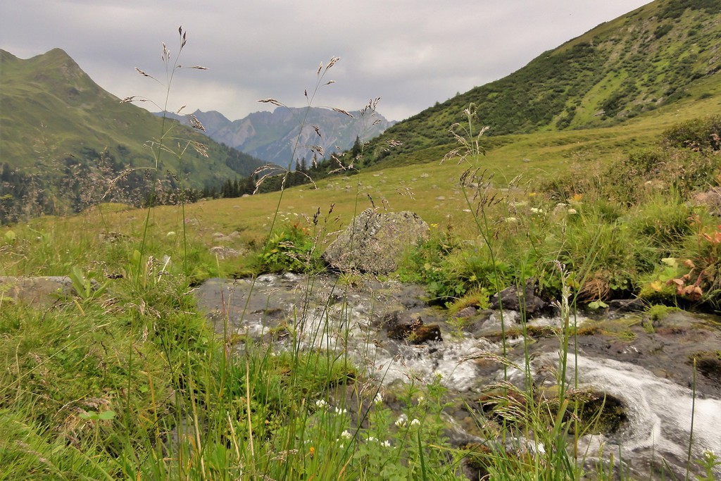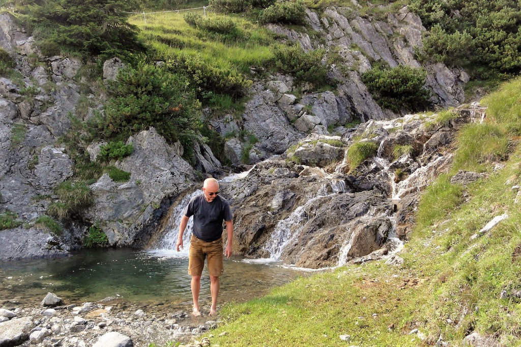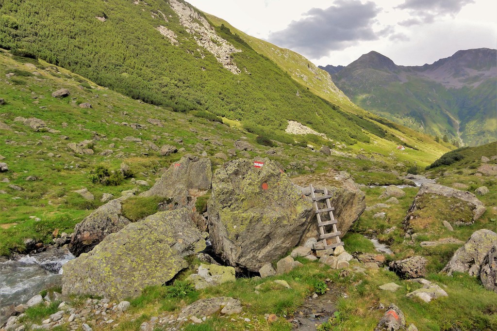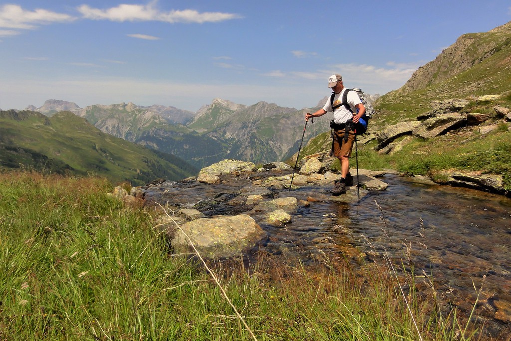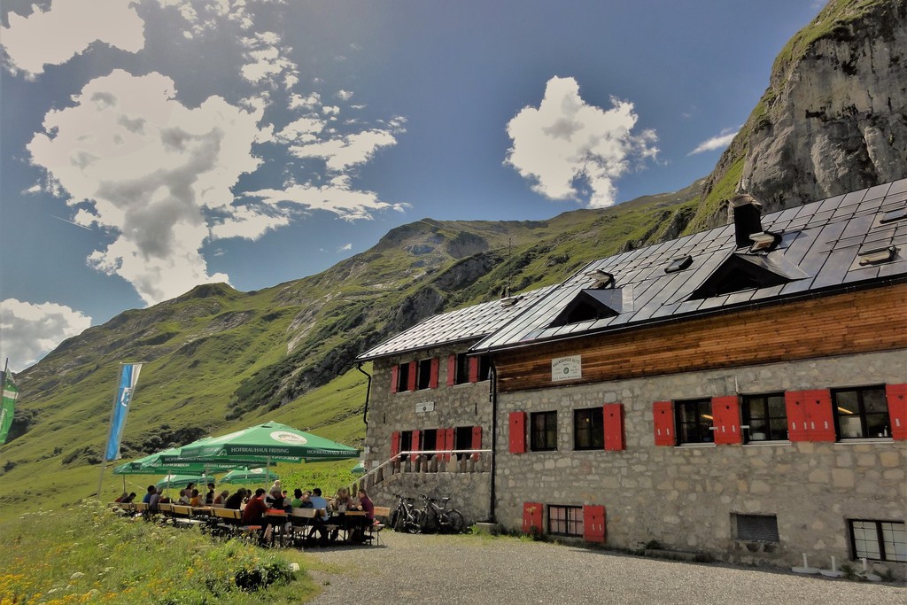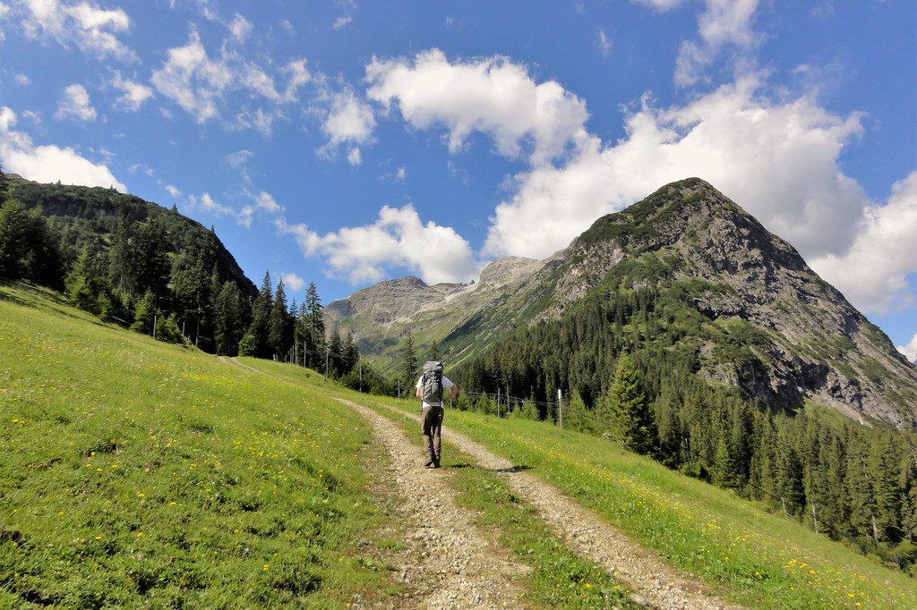 1. Tag: Zu Beginn unserer Alpenüberquerungf führen wir zusammen einen Ausrüstungs-check durch und haben noch Zeit für letzte Fragen, bevor es losgeht. Ein Taxitransfer bringt uns in´s Stillachtal- und der erste Aufstieg unserer Alpenüberquerung kann beginnen: Dieser führt uns von Birgsau durch das Rappenalptal nach Lechleiten. Anfangs noch recht flach- und sehr gut zum "Einlaufen"- verläuft der Anstieg dann im 2. Teil eindrucksvoll entlang des Schrofenpasses. Am Pass, 1688 m, überqueren wir die Grenze zu Österreich und können den weiteren Verlauf unserer Alpenüberquerung bereits gut einsehen. Gemütlich geht es von hier hinunter nach Lechleiten zu unserem Gasthof.