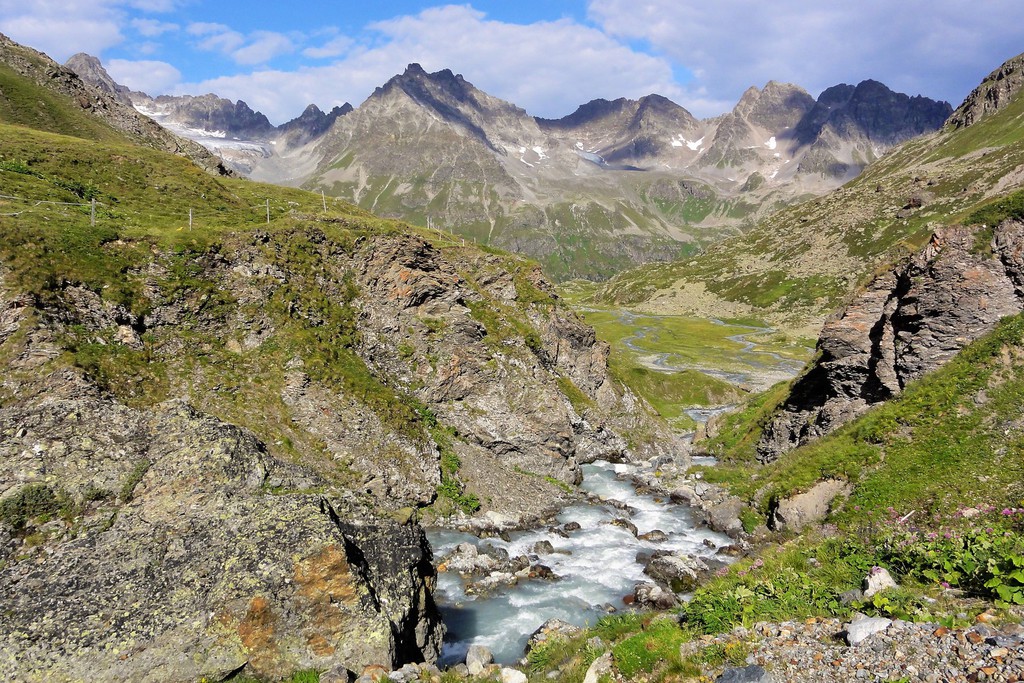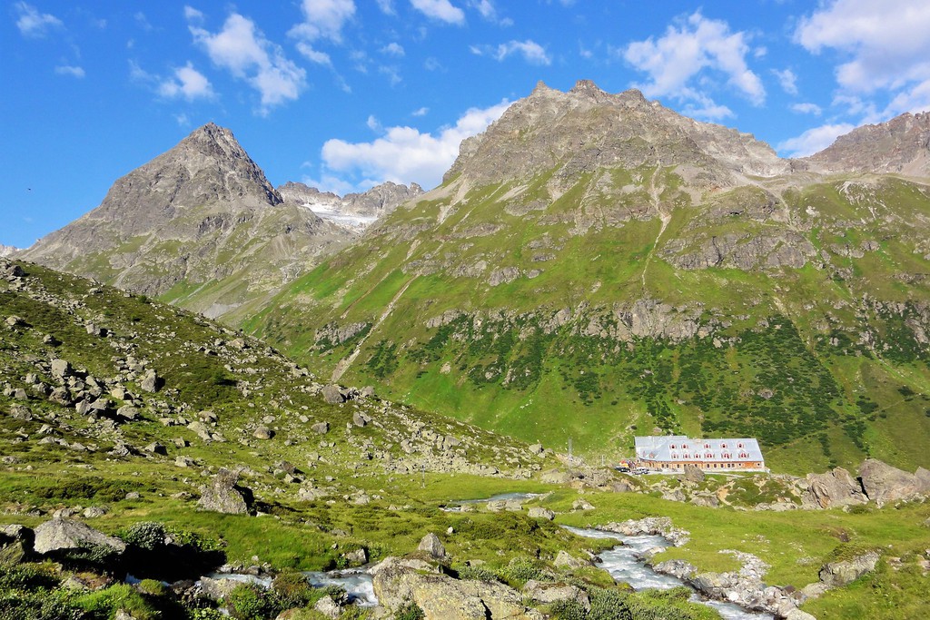 Heute nehmen wir Kurs auf die Satteinser Alpe, 1714 m. Nach einer Rast geht es in eindrucksvollem, alpinem Ambiente und vorbei an Pflunspitze, 2912 m, und einem kleinen Bergsee weiter zur Reutlinger Hütte, 2395 m. Hier legen wir eine wohlverdiente Pause ein, um uns für den Abstieg zur Konstanzer Hütte zu stärken. Mit Blick auf den mächtigen Pateriol, 3056 m, erreichen wir entlang des Pflunbachs am Nachmittag die idyllisch gelegene Hütte.
