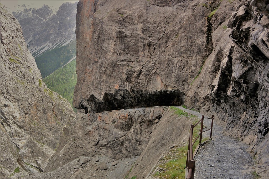 Zum Abschluss dieser Alpenüberquerung erwartet uns heute ein weiteres Highlight- die Begehung der Uina Schlucht. Am Morgen bringt uns ein Transfer zum Ausgangspunkt der heutigen Etappe nach Sur En, 1121 m. Auf unserem Weg in Richtung Schlinigpass treffen wir moderat ansteigend auf die Uina Dadaint- eine bewirtschaftete Alm kurz vor dem Beginn der Uina Schlucht. Hier stärken wir uns bei einer deftigen Brotzeit noch für die Begehung der eindrucksvollen Schlucht. Das Abenteuer kann beginnen: Hoch über dem Fluss Uina begehen wir über ein zentral in der Felswand angelegtes Felsband und durch mehrere Tunnel die Uina- Schlucht. Das alpine Ambiente und die Tiefblicke in die Schlucht sind einzigartig. Gut gesichert und entlang von Geländern gelangen wir über dieses anregende Felsband auf einer Höhe von ca. 2150 m schließlich an das Ende der Schlucht. Schon bald überqueren wir die Grenze zu Südtirol und passieren den Schlinigpass, 2309 m. Vorbei an der Sesvennahütte beginnt nun unser Abstieg durch das Schliniger Tal hinunter nach Schlinig. Wir umgehen den tosenden Wasserfall der Schwarzwand und werden von eindrucksvollen Ausblicken auf das Gletschermassiv des Ortler begleitet, ehe wir das geschmackvoll eingerichtete Hotel Aniggl- Hof in Schlinig erreichen: Die Alpenüberquerung ist geschafft!