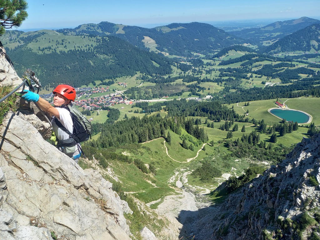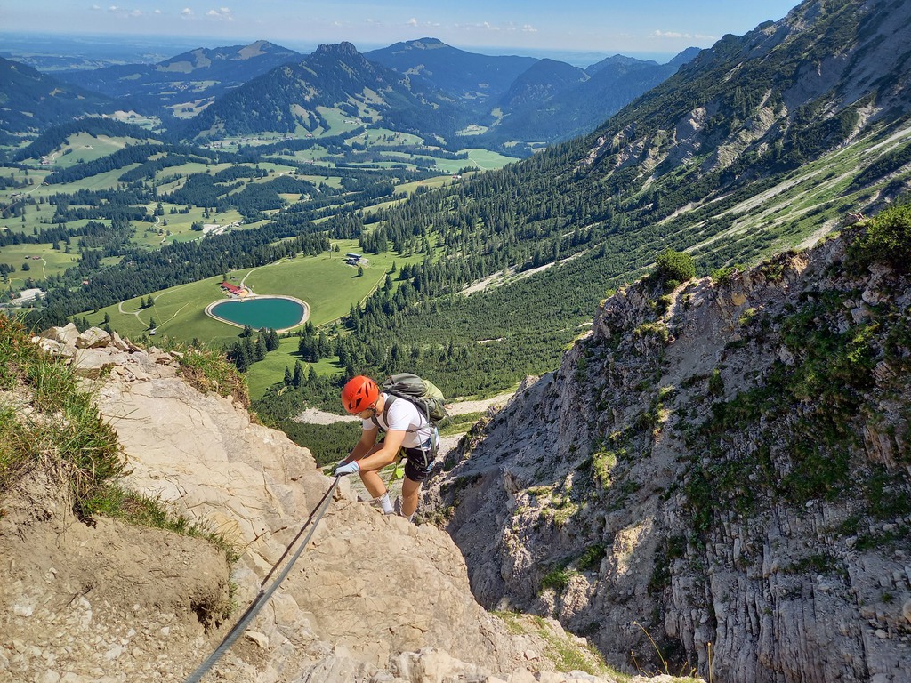 Bis zum Ende des Hindelanger Klettersteigs am Großen Daumen werden wir noch viele alpine Eindrücke sammeln. Über das Koblat und vorbei am Koblatsee geht es zurück zur Nebelhornbahn und gemütlich hinab ins Tal. Der erste Klettersteig ist geschafft!
