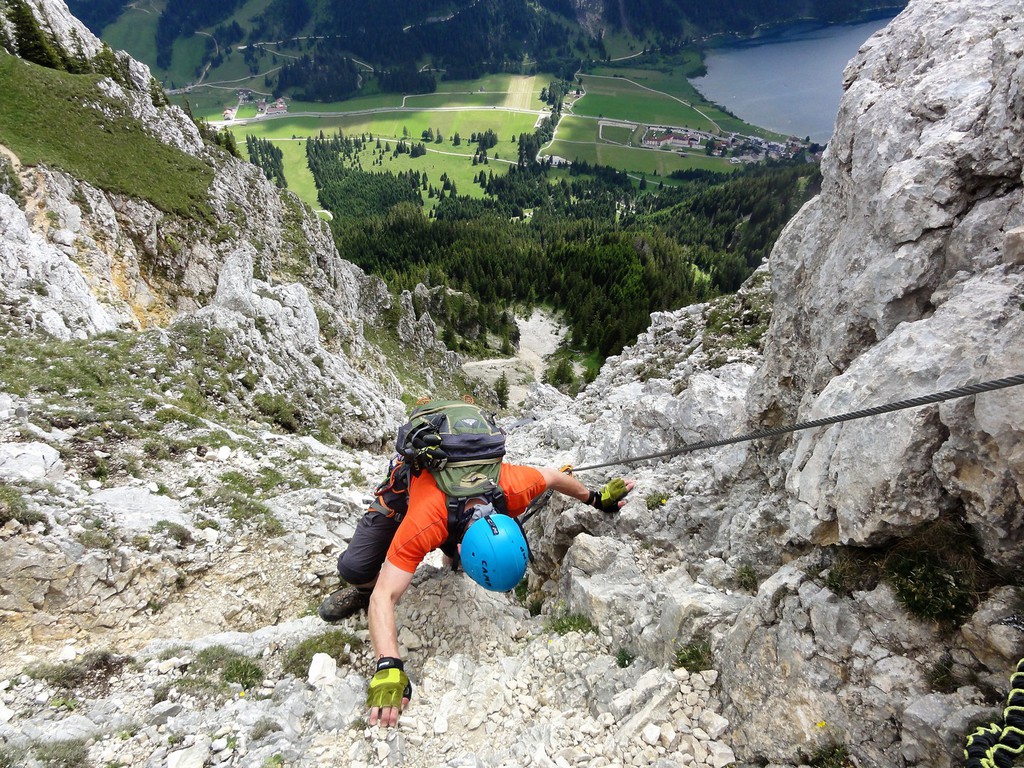 - Leihausrüstung: Klettersteigausrüstung (Klettergurt, Klettersteigset, Helm)